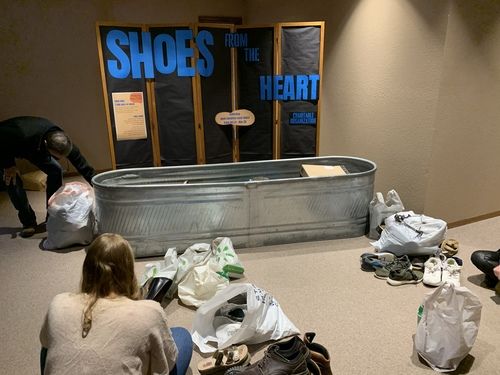 sorted shoes (for Shoes from the Heart to help Third World Countries and which also raise money to help a family adopt) (they exceeded their goal of 2,500 pairs and collected over 3,000!),