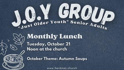 Senior adults, join our J.O.Y Group Lunches for food, fun, and fellowship. We’ll eat, play a game, get connected and updated about what’s going on in our church family, and pray together. It’s a good time together and we hope you’ll join us.